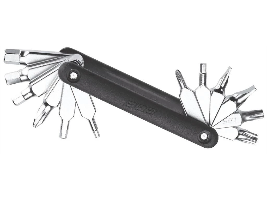 Hoogwaardig, zeer compact minitool met een vlak en licht ontwerp. De met rubber gecoate case van aluminium beschermt het gereedschap en voorkomt krassen op andere fietsonderdelen. 20 functies. Inbussleutels: 2, 2,5, 3, 4, 5, 6 en 8 mm. T25 torx. PH1- en PH2-kruiskopschroevendraaiers. Platte schroevendraaier. Kettingpons. Bandenlichters. Ringsleutels van 8, 9 en 10 mm. Spaaksleutels van 3,2, 3,3 en 3,5 mm.