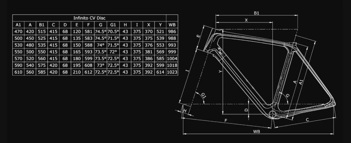 - Frame: Infinito CV Disc, Carbon w/Bianchi CV, Electronisch Di2/EPS shifting compatible, compatible met 32″ banden, BBset PressFit 86,5x41mm, steekas 12x142mm, sizes 47-50-53-55-57-59-61cm