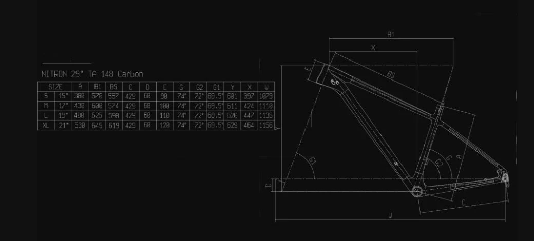 - Frame: Nitron 29″ full carbon Monocoque, 1,5″ tapered HT, BB92, zadelpen diam. 27,2mm, HDM FD, PM 160mm carbon dropout 12x148mm Boost steekas, interne kabelgeleiding, maten 15-17-19-21″.