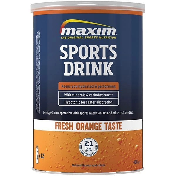 Maxim Sports Drink is een gemakkelijk in water oplosbare poeder voor het bereiden van een lekkere hypotone sportdrank. Het levert de optimale hoeveelheid koolhydraten en mineralen (= elektrolyten) die je nodig hebt tijdens het sporten. Maxim Sports Drink bevat van alle sportdranken de meeste mineralen en elektrolyten.