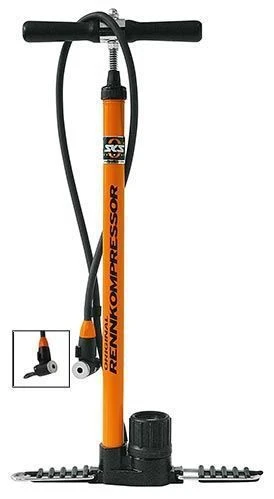 Wedergeboorte van een legende! De RENNKOMPRESSOR is al bijna 40 jaar de meest geliefde pomp binnen de internationale wielersport. Deze pomp mag met recht de stamvader van alle vloerpompen worden genoemd. De RENNKOMPRESSOR is naar keuze leverbaar met de klassieke messing ventielkop voor racefietsventielen (presta/sclaverand) of de hevelkopnippel voor autoventielen (Schrader) Maar ook met de op alle ventielen passende EVA of Multi Valve kop.