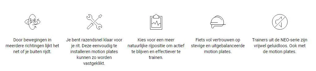 - Als aanvulling op de beweging van links naar rechts van je NEO trainer, zorgen deze motion plates voor meer realistische bewegingen in meerdere richtingen die echt als een buitenrit voelen. Kies voor een meer natuurlijke houding en train nog effectiever.