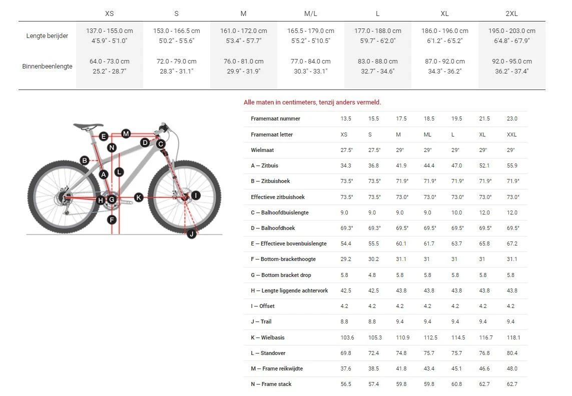 - Size: M , ML , L , XL , XXL: RockShox Recon Gold RL, DebonAir luchtvering, Motion Control demper, lockout, taps toelopende stuurbuis, 42 mm offset, Boost110, 15 mm Maxle Stealth, 100 mm veerweg